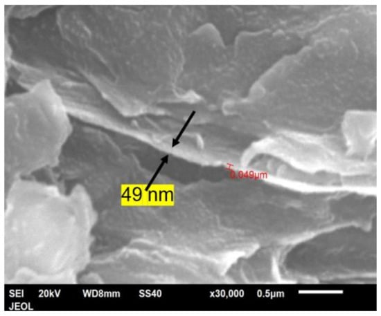 High-magnification SEM image of the 25 vol.% Al platelet–PET composite; the Al platelet is 49-nm thick and about 2-μm wide. The aspect ratio is ~40.