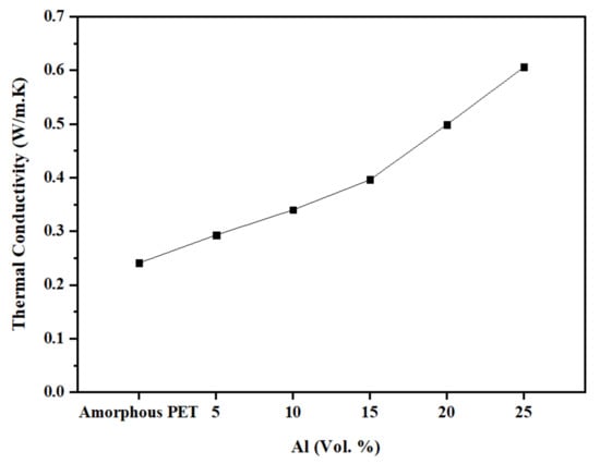 The thermal conductivity values for the amorphous PET and the Al–PET composites are shown in Figure 21. A gradual increase in the thermal conductivity of the composites is observed with increase in the loading of the aluminium particles. Whereas with the electrical conductivity, we were just below the volume fraction for percolation, we were well below the threshold concentration where the thermal conductivity shoots up. Typically, the percolation threshold for thermal conductivity is higher than for electrical conductivity, and is over 60 vol.%. In the 25 vol.% Al composite, the thermal conductivity was over 2x the base material (0.606 W/m.K). Industrial heat-conducting plastics on the market have conductivities in the range of 0.4–40 W/m.K; hence, we are at the bottom end of the commercial conductive plastics. Again, with hot powder compaction, we could reach the loading levels (60 vol.%) needed for reaching the percolation threshold for thermal conductivity, but this is not possible with injection-moulding.