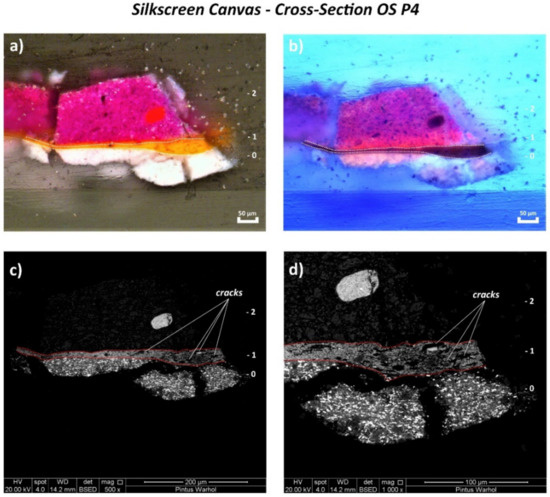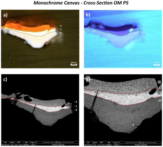 The stratigraphy of two cross-sectioned samples of the monochrome canvas (OM P5 and OM P6) and three cross-sectioned samples of the silkscreen canvas (OS P3, OS P4, and OS P5) was studied with both OM and SEM/EDX. To prepare cross-sections, a tiny and representative fragment was taken from the selected samples and embedded into epoxy resin (type Araldite 2020/A) with an amount of 3% of hardener (type 2020/B, Huntsman, USA). In order to observe the stratigraphy under OM without any interference of a rough surface, the cross-sections were polished by using abrasive grinding paper based on silicon carbide (SiC) with different grit sizes (from 600 to 12,000 grits) after drying/hardening for 5 days at room temperature.