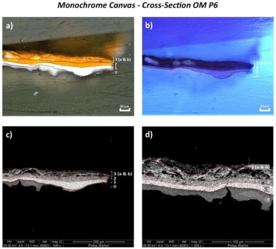 The two white ground layers of OM P5 and OM P6 were better distinguished by ultraviolet light (UV) under the OM (Figure 2b and Figure 3b), whereas the different layers of the complete paint stratigraphy were visualized best by the SEM micrographs (Figure 2c,d and Figure 3c,d). The main chemical components identified for each layer are summarized in Table 2 and fully described hereafter.
