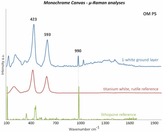 The differentiation between titanium white in either the rutile or anatase form in white ground layer 1 was accomplished by µ-Raman measurements. Thus, the more stable rutile form of titanium white was detected according to the bands at 423 and 593 cm−1 (Figure 4). Titanium white in the rutile form was firstly successfully synthesized in 1937, becoming increasingly available on the market during the second half of the twentieth century [18].