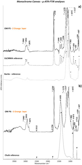 ATR spectra of orange layers (a) 2 and (b) 3 of OM P5 and OM P6, respectively. The ATR spectra of the EA/MMA acrylic (*), barite (BaSO4) (+), and chalk (CaCO3) (#) references are also included.