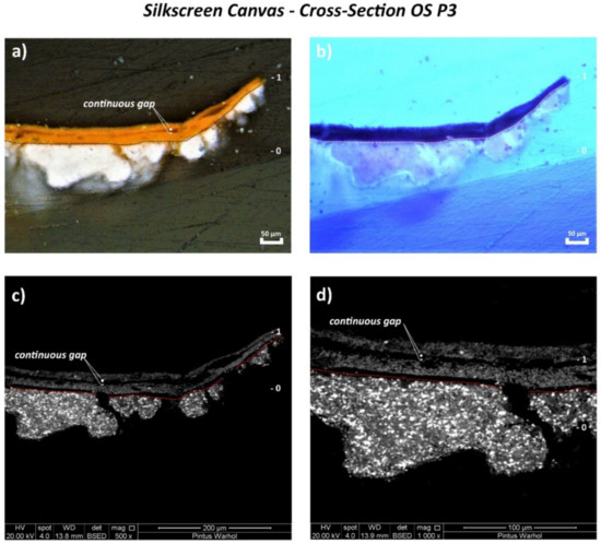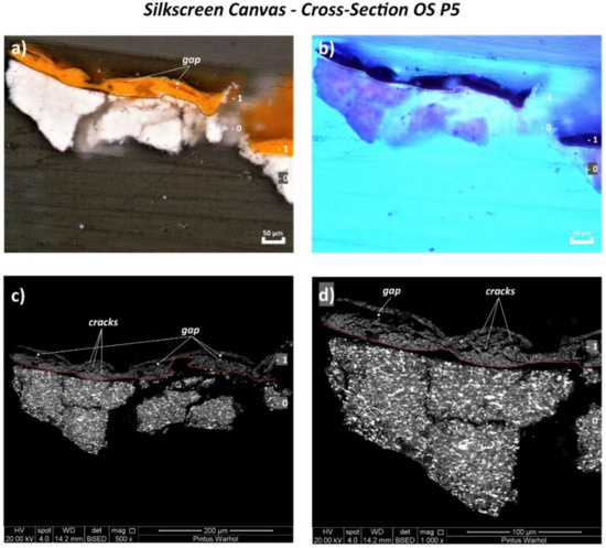 The orange layer of OS P3 and OS P5 appeared as two layers detached from each other with a continuous gap in between (Figure 8a and Figure 9a), likely as a result of the loss in adhesion of the paint layer. This physical effect is better depicted by the SEM micrographs in Figure 8c,d and Figure 9c,d. Moreover, the formation of several parallel cracks distributed from the top to the orange paint substrate was also visualized by SEM (Figure 9c,d and Figure 10c,d).