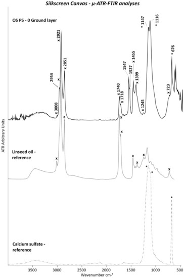 ATR spectra of white ground layer 0 of OS P5. The ATR spectra of the linseed oil (x) and calcium sulfate (CaSO4) (*) references are also included.