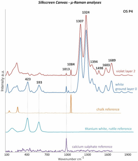 In addition to confirming the presence of gypsum based on the band at 1013 cm−1, µ-Raman measurements allowed for the characterization of the titanium white pigment as the rutile form based on its main bands at 423 and 593 cm−1 (Figure 12).