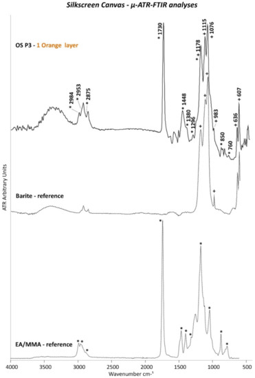 Concerning the binder, the THM–GC/MS analyses carried out on OS P1 (white and orange layers) showed an EA/MMA type of acrylic binder in addition to a drying oil binder (Figure 13a). As discussed before, µ-ATR–FTIR analyses on the cross-sectioned samples permitted the localization of each organic binder to one of the two paint layers. Indeed, as shown in Figure 14 and similarly to the first orange layer of the monochrome canvas, the EA/MMA acrylic binder was found in the orange layer of the silkscreen canvas according to its characteristic IR bands (2984, 2953, 2875, 1730, 1448, 1380, 1296, 1178, 850, and 760 cm−1).