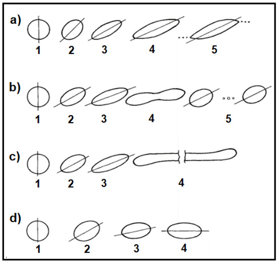 Various deformation modes of a particle subjected to a simple shear flow for (Ca ≥ Ca(crit)). (a) k = 2 × 10−4; (b) k = 1; (c) k = 0.7 and Ca = Ca(crit)); (d) k = 6. Adapted from [28].