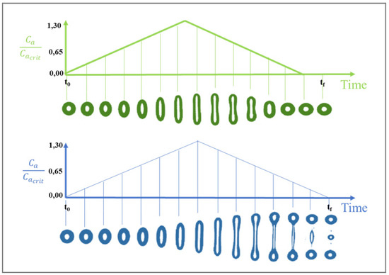 Droplet response to a triangular flow rate–time profile where the maximum capillary number was reached in 42 (top) and 46 (bottom) seconds. Adapted from [37].