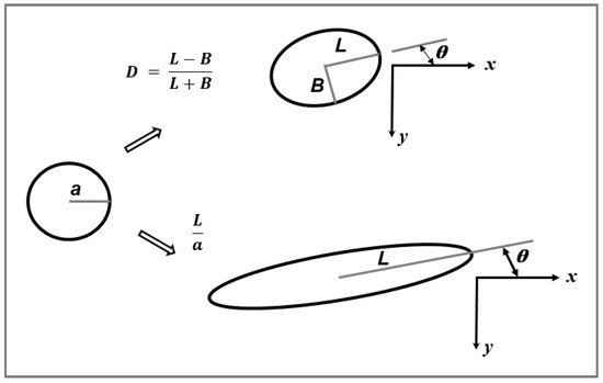 Definition of length (L), width (B), and orientation angle (α) of a deformed spherical droplet with an initial radius ‘a’ in simple shear flow. Adapted from reference [27].