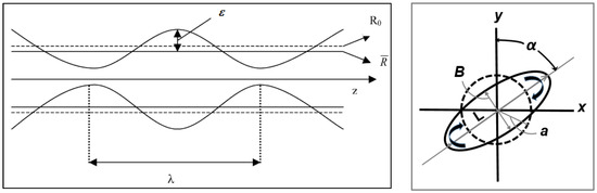 Left: schematic representation of capillary instability (sinusoidal distortion) taking place as a cylindrical thread with an initial radius R0 is extended. Here, (Equation (19)) is the average radius, ε is the amplitude of the distortion, λ is the wavelength and z is the Cartesian coordinate along the cylinder’s main axis. Right: Length (L), width (B), and orientation angle (α) of a deformed spherical droplet with an initial radius ‘a’ in simple shear flow. Adapted from [39].