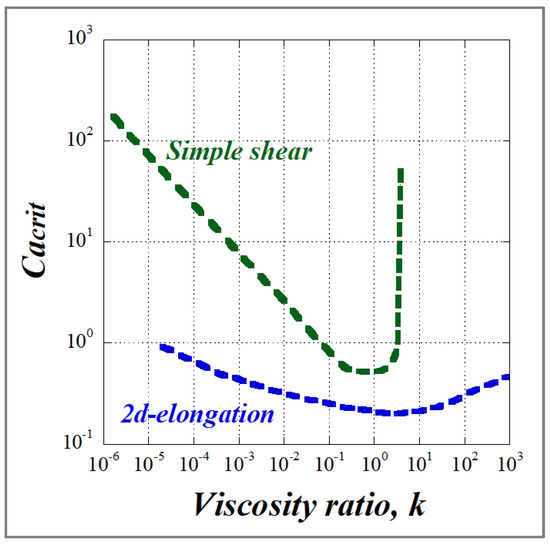 - Khakhar, D.V.; Ottino, J.M. Deformation and breakup of slender drops in linear flows. J. Fluid Mech. 1986, 166, 265–285. [Google Scholar] [CrossRef]