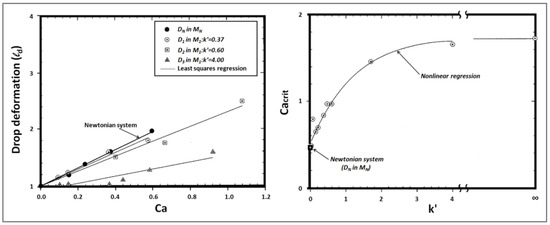 All the aforementioned studies on droplet deformation and breakup in Newtonian systems were realized under quasi-equilibrium conditions, without including the time. In general, the flow field in industrial mixers is not homogeneous. As a result, the flow rate experienced by a moving droplet is time-dependent (transient flow) and the burst does not occur unless there is enough time provided for the breakup. An example of the influence of time-dependent flow on droplet deformation is given in Figure 5. The Figure displays two single drop experiments in an elongational flow generated by a device with opposed jets [37]. A polybutadiene droplet (ηd = 12 Pa·s) was used in a polydimethylsiloxane matrix (ηm = 9 Pa·s), and the radius of the droplet was 0.48 mm, whereas the interfacial tension was equal to 4 mN/m. In both experiments, the capillary number was first increased from zero to 1.3 Ca(crit) and then decreased back to zero. In the first experiment, the maximum capillary number reached 42 s after the start of the experiment: the droplet deformed as the capillary number increased and then retracted back to a sphere again. In the second experiment, the capillary number was increased at a slower rate and the maximum capillary number was reached in 46 s. In this case, the drop did not retract back to a sphere but continued to elongate until breakup occurred. It should be noted that the viscosity ratio k = 1.3 with (Ca/Ca(crit) < 2) in both experiments.