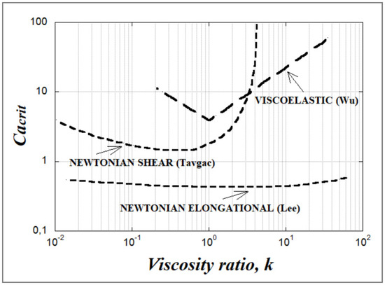 When deformation of the fiber takes place during flow, there occurs a superposition of a supplementary flow-induced deformation on the one due to Rayleigh instabilities, resulting in the breakup time given by Equation (22) no longer being valid [43,44]. The fiber extension due to the flow reduces the instability growth rate whereby the fiber stabilizes. This assumes that (i) the fiber deforms affinely with the matrix (Ca/Ca(crit) ≥ 2); (ii) the fiber is ruptured when the instability-induced local diameter reduction rate is greater than that caused by the fluid deformation; and (iii) that the instability wavelength is independent of fluid flow [43].