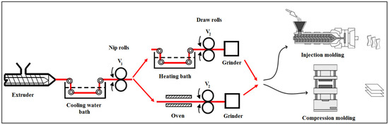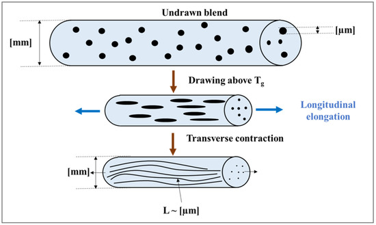 The elaboration of NFCs involves mixing in the molten state a first polymer intended to form the matrix and a second polymer intended to form the nanofibrillar phase. The mixing conditions should be chosen to induce the formation of nanofibrils during cooling and drawing, followed by shaping through injection molding or extrusion at a temperature that is most often higher than the working temperature of the first matrix-forming polymer, but lower than that of the second polymer forming the nanofibrillar phase. The final shaping at a temperature below the processing temperature of the nanofibrillar phase allows the nanofibrils formed following the cooling of the polymer blends to be preserved. The orientation of the nanofibrils is mainly imparted during the shaping process of the polymer blends and to a lesser extent during the preparation of the molten resins. The nanofibrillar phase thus provides a reinforcement function thanks to an improvement in the mechanical resistance of the obtained nanocomposite materials [6,7]. During the manufacture of nanofibrillar composites (NFC) comprising a thermoplastic matrix (A) and a reinforcing thermoplastic component (B), the former generally has a melting or working temperature (TwA) below the corresponding temperature of component constituting the reinforcement, i.e., TwA < TwB.