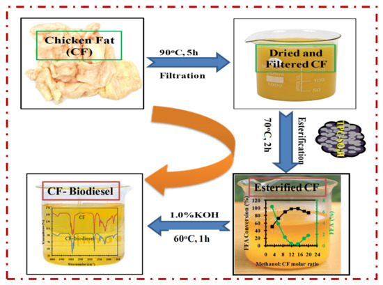 - The produced catalyst was then successfully utilized to synthesize biodiesel from waste chicken fat through a two-step conversion process of esterification to decrease the FFA content of chicken fat, followed by conventional alkali-catalyzed transesterification.