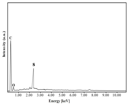The chemical composition of the TPC-SO3H catalyst was confirmed by the energy dispersive X-ray spectrometry technique (EDAX), as displayed in Figure 5. From the EDAX result, we observe the presence of C, O, and S elements in the TPC-SO3H catalyst.