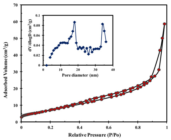 The TPC-SO3H catalyst pore size distributions and N2 adsorption-desorption isotherms obtained at −196 °C are shown in Figure 6. The isotherm generated by the TPC-SO3H exhibited a narrow hysteresis loop with increasing pressure over the P/P0 range of 0.6–1.0, which confirms a typical type-IV isotherm and approximately 79.8 m2/g BET surface area. The TPC-SO3H pore size distribution is summarized in the inset of Figure 6. There are two distinct mesoporous structures with pore sizes ranging between 17.6 nm and 34.2 nm on average. The corrosive effect of concentrated sulfuric acid on the pore walls of the tire might explain the presence of the bimodal nanostructure of the catalyst.