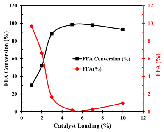 Lastly, we investigated the influence of the TPC-SO3H solid catalyst dosage fed into the reaction on the conversion efficiency of FFA to FAME. The catalyst loading in the esterification was varied from 1 to 10 wt.% while maintaining 70 °C temperature for 120 min duration, with a 15:1 methanol-to-CF molar ratio. The FFA conversion increased rapidly from 30% to 98.8 % when the catalyst dosage increased from 1 to 5 wt.%, however, further increasing the catalyst dosage decreased the conversion efficiency, as displayed in Figure 10. We present a conjecture that adding an excessively high amount of the TPC-SO3H solid catalyst into the reaction system decreases the solubility of the methanol and CF, hence limiting the mass transfer. Therefore, we conclude that the maximum biodiesel was produced at 5 wt.% catalyst dosage.