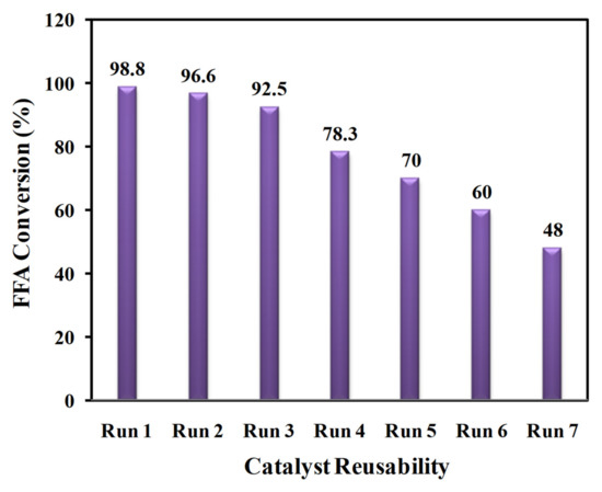The prominent merit of employing solid acid catalysts is that they can easily be recovered from the reaction mixture and reused over various reaction cycles. We studied the tenor of the activity of regenerated solid acid TPC-SO3H catalyst by conducting esterification runs seven times sequentially under optimum reaction conditions at 70 °C and 120 min with a 15:1 methanol: CF molar ratio, and a catalyst dosage of 5 wt.%, as ascertained previously. It can be inferred from Figure 11 that there is a continuous loss in the activity of the catalyst with acceptable reusability up to three cycles. The steady and gradual death of the active sites in each run may explain the gradual decline in the catalytic activity during the latter two runs of the first three cycles. However, we notice that after the third cycle of repeated use, the catalytic activity decays dramatically. A few plausible explanations for this significant activity waning are as follows: (i) the weak bonding of -SO3H groups with the carbon structure may lead to leaching of these active sites, (ii) the -SO3H, –OH, and –COOH groups present stable Brønsted sites because of which these sites have a high propensity to absorb water from the reaction mixture, which in turn prevent the reactants from engaging with the acidic sites, (iii) the accumulation of the reactants might deactivate the catalyst active sites, and (iv) the morphology of the catalyst alters due to continuous reuse up to the third cycle which may have disintegrated the carbon structure; in such case, the pore size of the carbon structure becomes smaller preventing the reactants from interacting with the sulfonic and acidic sites.