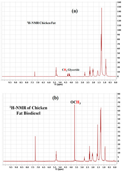 A Bruker Avance-III 300 MHz NMR Spectrometer (Bruker, Milan, Italy) was used to capture the 1H-NMR spectra of the chicken fat (CF) and CF-derived biodiesel. Deuterated chloroform (CDCl3) and tetramethylsilane were employed as a solvent and the internal standard, respectively. The transesterification reaction was monitored via 1H-NMR spectroscopy. The following equation describes the conversion: