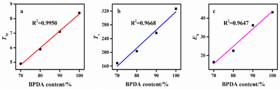 Relationship between mechanical properties and the biphenyl group content in polymer backbone.
