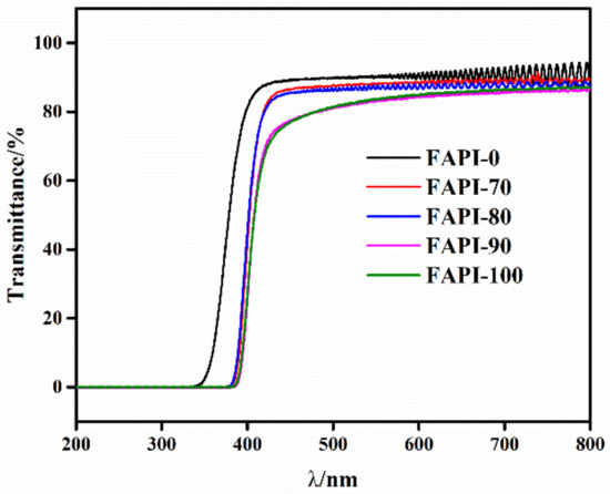 Figure 4 shows the UV spectra of the FAPI films, which exhibits great visible transparence. With the increasing of the biphenyl contents in polyimide backbones, the light transmittance at 500 nm (T500) was reduced gradually from 89.7% (FAPI-0) to 81.4% (FAPI-100) (Table 2), and the cutoff wavelength (λcut) was red-shifted from 334 nm (FAPI-0) to 381 nm (FAPI-100). Moreover, the yellowness (YI) increased from 1.3 (FAPI-0) to 6.9 (FAPI-100) and haze (HZ) from 1.7 (FAPI-0) to 4.1 (FAPI-100), respectively. Clearly, the optical transparency of FAPI films was deteriorated with the increasing of the biphenyl contents in polymer backbone, probably attributed to the higher bandgap energy of the biphenyl groups than the −CF3 groups in polymer backbones.