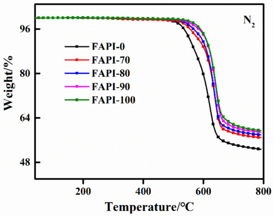 TGA curves of the FAPI films with different biphenyl content in polymer backbone.