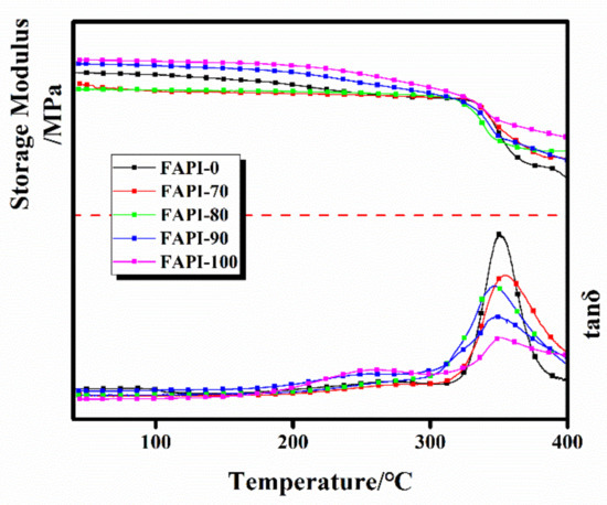 The glass transition temperature of the FAPI films were measured at about 350 °C by DMA (Figure 6). The Tg values of the FAPI films were almost identical although the biphenyl contents varied. This could be attributed to the steric hindrance caused by the bulky −CF3 groups linked at the biphenyl groups, which obstructed the twist moving of the polymer backbone and resulted in the high glass transition temperature. It is worth noting that all of the FAPI films showed Tg values which are higher than the finally cured temperature (330 °C), indicating that the imidization process is a local process of cyclization and dehydration without much molecular chain moving ability [27].