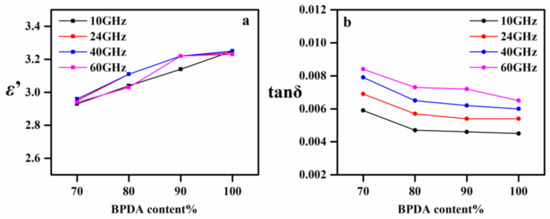 Introduction of −CF3 groups in polymer backbones has been considered as an effective way to reduce the dielectric constant of polyimides. This is attributed to the strong electron absorption and large free volume of fluorinated groups. It can be seen that the dielectric constants of the FAPI films were changed from 2.68 (FAPI-0) to 3.25 (FAPI-100) at 10 GHz, which is closely related to the decline of the fluorine contents (F%). The frequency also affects the dielectric constant. Under the applied electric field, dielectric properties of a polymer are mainly attributed by three kinds of polarization ways, namely orientation polarization, atomic polarization and electron polarization with the inherent frequencies of 109 Hz (1 GHz), 1012 Hz (103 GHz) and 1015 Hz (106 GHz), respectively [28]. The atomic polarization and electron polarization are also called deformation polarizations. In our research, the test frequencies (10–60 GHz) are dominantly located in the range of inherent frequencies of orientation polarization and atomic polarization. If the inherent frequency of orientation polarization of the FAPI films is lower than the frequency of the applied electric field, the dielectric constants of different testing samples would not change much. Furthermore, because the frequency of the applied electric field does not reach the inherent frequency of deformation polarization, the polarization of atoms and electrons has sufficient relaxation time, having no influence on dielectric constant (ε’).