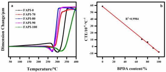 Figure 9 compares the TMA curves (a) and CTE values (b) of the FAPI films. With the increasing of biphenyl content and the decreasing of −CF3 groups in polyimide backbone, the CTE value of the FAPI films was decreased significantly from 58.6 × 10−6/°C (FAPI-0) to 10.6 × 10−6/°C (FAPI-70), and 6.4 × 10−6/°C (FAPI-80), respectively, which is probably attributed to the reduction of the free volume of polymer structure [29]. The rigid polyimide backbones showed weaker in-plane expansion behavior and stronger in-plane orientation extent, resulted in low CTE. Surprisingly, the FAPI-90 and FAPI-100 showed a negative CTE values, implying that the polymer aggregate was shrank at high temperature.