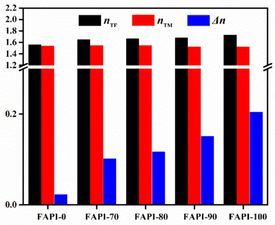Figure 10 compares the birefringence behaviors of the FAPI films measured by a prism coupler at a wavelength of 633 nm. With the increasing of biphenyl contents in polymer backbone, the in-plane refractive index (nTE) of the FAPI films were increased gradually from 1.5613 (FAPI-0) to 1.7303 (FAPI-100), and the out-of-plane refractive index (nTM) were reduced accordingly from 1.5379 (FAPI-0) to 1.5250 (FAPI-100). Thus, the Δn value was increased from 0.0234 (FAPI-0) to 0.2053 (FAPI-100), indicating that the polymer orientation extent was also increased gradually. The results further proved that the dielectric loss of the FAPI films at high frequencies could be reduced by enhancing the polymer chain orientation and stacking density, which limited the deflection of the dipole, atom, electron under alternating electric field.