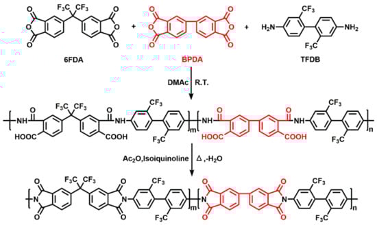 4,4′-(Hexafluoroisopropylidene) diphthalic anhydride (6FDA), 2,2′-Bis(trifluoro-methyl)benzidine (TFDB) and 3,3′,4,4′-Biphenyltetracarboxylic dianhydride (BPDA) was purchased from Chinatech (Tianjin, China) Chemical Co., Ltd. and dianhydrides including 6FDA and BPDA were used after vacuum drying at 160 °C for 3 h. Dimethylacetamide (DMAc) was purchased from Concord Technology (Tianjin, China) Co., Ltd. and used without distilled. Acetic anhydride was obtained from Sinopharm Chemical Reagent Co., Ltd. (Shanghai, China) while isoquinoline was obtained from Shanghai Aladdin Biochemical Technology Co., Ltd., (Shanghai, China) and both of them were directly used.