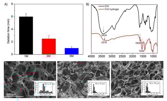 In addition, a slight dependence of the pore size of the hydrogels and the concentration of the NaOH solution can be observed in Figure 2C–E. Although a low concentration (1 M) of a strong base such as NaOH caused the precipitation of chitosan hydrogels, it seems to have led to a decrease in hydrogen bonds or hydrophobic interactions within the polymer, with respect to higher concentrations of NaOH (3 M and 5 M), resulting in more open networks with remarkable larger pore dimensions (~103 μm vs. ~40 µm).