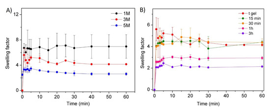 Figure 3A shows a clear dependence of hydrogel swelling on the NaOH concentration. Certainly, the high pH values of the medium (NaOH 3 or 5 M) promoted chitosan intramolecular–intermolecular interactions, resulting in a higher crosslinked network with smaller pore size, as shown in the SEM analyses, which limited water absorption and, therefore, the swelling capacity of the hydrogels. Indeed, significantly lower swelling factors were obtained for NaOH 3 M (swelling factor ~5) or NaOH 5 M (swelling factor ~3) in comparison with NaOH 1 M (swelling factor ~7). On the other hand, the influence of the coagulation time for a fixed concentration of sodium hydroxide (3 M) on the swelling capacity of the prepared materials was also studied (Figure 3B). Higher coagulation times favoured the establishment of hydrogen bonds and/or hydrophobic interactions, increasing crosslinking density and, consequently, leading to networks that are more compact with a lower swelling ability. This influence reveals that despite the fact that gel formation occurs in situ (tgel), the establishment of interactions continues over time (t∞~3 h).