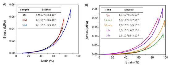 Mechanical compression stress–strain tests. Influence of (A) ionic strength of the gelling medium and (B) of the gelling time for CHI/NaOH 3 M hydrogels.