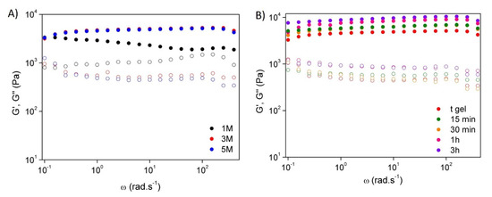 The rheological behaviour of the hydrogels was evaluated by frequency sweep tests at room temperature in order to study the effect of sodium hydroxide solution concentration (Figure 5A) and coagulation time (Figure 5B). It was noticeable that all samples behaved like a hydrogel once the storage modulus (G’) was higher than the loss modulus (G’’) in all frequency ranges. Furthermore, as the concentration of NaOH increased, both G’ and G’’ increased, leading to an improvement of the rheological properties, especially for those hydrogels prepared with NaOH 3 M and 5 M, which presented similar behaviour. Additionally, hydrogels formed by the addition of NaOH 3 M showed a slight improvement in their rheological properties with increasing coagulation time. This behaviour, as was also revealed in the mechanical properties, can be ascribed to the higher number of interactions established between chitosan chains over time, which leads to the formation of elastic auto-stable materials, i.e., strong hydrogels [31].