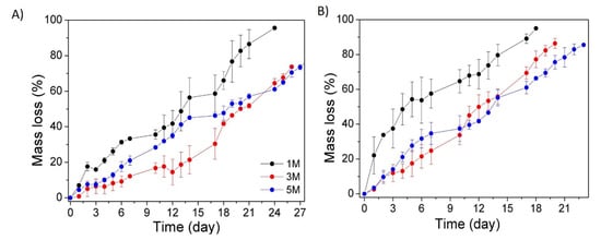 In general, it can be observed that hydrogels with a remarkably higher swelling ability, such as those coagulated with 1 M NaOH solution, experienced faster and larger mass loss regardless of the presence of the enzyme as a consequence of their more open networks. In addition, the presence of the enzyme accelerated (~30%) the mass loss of the hydrogels.