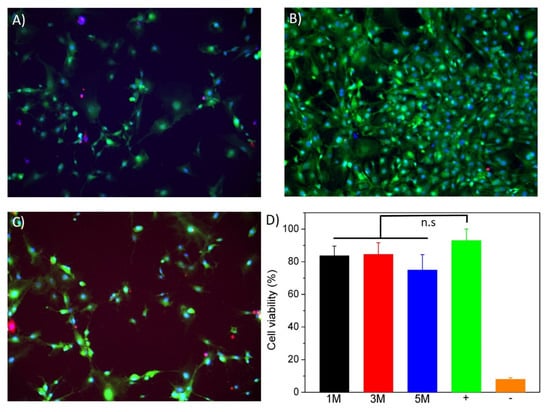 (A–C) Fluorescent images corresponding to CHI-based hydrogels coagulated with (A) NaOH 1 M, (B) NaOH 3 M and (C) NaOH 5 M. (D) Normalized cell viability results. In the positive control conditions, cell membranes were permeabilized by incubation in ethanol. Cells in the negative control conditions were cultured in absence of hydrogels. One-way ANOVA test with Tukey’s multiple comparison test was used for the statistical analysis (p < 0.05). (n.s) No significant differences.