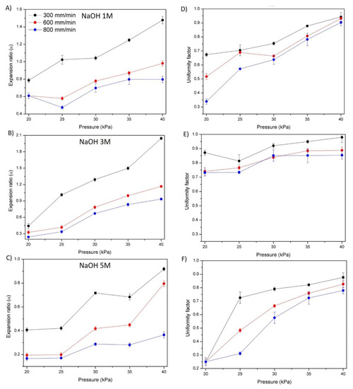 As is presented in Figure 4A, all hydrogels displayed a similar compression modulus (~6.1.10−4 MPa); however, an increasing stress was required to reach their maximum deformation as NaOH solution concentration increased. In this sense, the gel formed by 5 M NaOH showed the largest resistance to deformation and required the highest stress to reach its maximum deformation (89%). This may be a consequence of the higher interactivity between polymer chains derived from a more effective coagulation, leading to higher crosslinking density. These results are in good agreement with morphological and swelling data. In contrast, when the concentration of NaOH decreased to 1 M and 3 M, lower deformations at breakage and lower stress were needed for maximum deformation. As previously shown, the use of a lower ionic strength results in less interconnected three-dimensional networks, leading to softer hydrogels.