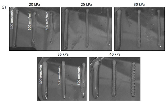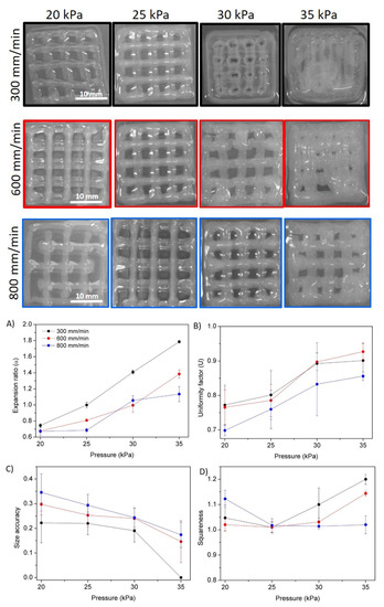 Digital images of printed square scaffolds of CHI/NaOH 3M hydrogel at different pressures and extrusion speeds with a 25 G nozzle. (A–D) Evaluation of the quality of printed structures: (A) expansion ratio, (B) uniformity factor, (C) size accuracy and (D) squareness.