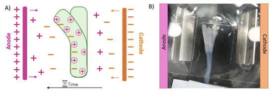 There are different theories to explain the behaviour of electroactive hydrogels when an electric field is applied. Flory’s theory of osmotic pressure is typically used for the explanation of polyelectrolyte-based hydrogels’ bending behaviour [36]. In this case, when an electric field is applied through the material, the free ions present in solution (Na+ and Cl, and in this case possibly OH− residues) move toward their counter electrodes, leading to an osmotic pressure difference (∆π) along the direction of the potential difference inside and outside the hydrogel, due to the differences in concentration of these ions [21]. Consequently, in polycationic hydrogels (∆π < 0) the hydrogel swells on the cathode side while it shrinks in the anode, therefore bending to the anode side. In addition, the application of an electric field produces the electrolysis of the NaCl solution of the electrolytic media. In the negative pole (cathode), hydroxyl (OH−) groups are created, and hydrogen gas is produced (2H2O + 2e−→ 2H2(g) + OH−). On the other hand, in the positive pole (anode), chlorine gas is formed due to the consumption of chloride ions (2Cl− → Cl2(g) + 2e−). In this way, the produced hydroxyl groups move towards the anode while the free sodium cations that are present in the electrolytic solutions travel up to the cathode [34]. Within chitosan-printed strands, ionized amine groups (positively charged) are balanced by the negatively charged ions (OH−) that are moving from the cathode to the anode and, at the same time, they are repelled from ions in the cathode (Na+) (Figure 10A). This fact makes the hydrogel swell on the side that is closest to the cathode and shrink on the anode side, thus bending toward the positive electrode [21,34]. Taking this electric response into consideration, the hydrogels showed a bending response suitable for the development of bioinspired soft actuators for soft robotics, allowing the further development of dynamic scaffold-based microenvironments for cell regeneration in biomedical applications [37].