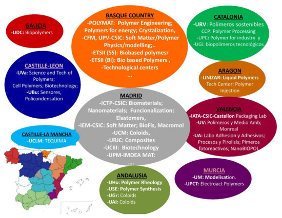 It is important to add that, although this overview is focused on the R+D polymer research from universities and scientific institutions, polymer science and technology in Spain has a network of specific Polymer Technology Centers (or centers which are mostly dedicated to them) attached to different communities and distributed throughout the geography (i.e., AIMPLAST; AIITIP; CIDAUT, CIDETEC, GAIKER and others).