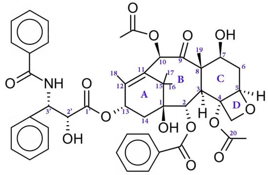 Regarding the chemical structure of PTX (Figure 1), its 20-carbon compound (C20) belongs to the diterpene class of natural compounds []. The anticancer activity is mainly recognized for ring A, ring D (the oxetane ring), the C2 benzoyl group, and some components such as the C3′ amide-acyl group and the OH group at C2′, which attaches on the side chain to C13 []. On the other hand, other groups slightly affect the therapeutic activity of PTX such as the carbonyl group on C9 and the acetyl group on C10. Moreover, the specified conformation of the paclitaxel molecule is provided by the acetyl group [].