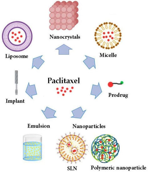 As previously mentioned, the physicochemical properties and the nature of PTX complicated its formulations. Consequently, several delivery systems for PTX have been developed to enhance its solubility and pharmacological properties involving micelles, liposomes, nanoparticles, the prodrug approach, emulsions, implants, and nanocrystals [,,,]. Figure 2 summarizes the most common strategies utilized for PTX delivery systems.