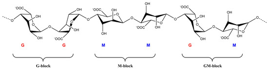 ALG is a linear biopolysaccharide copolymer consisting of 1,4-linked β-D-mannuronate (M) and α-L-guluronate (G), which can be arranged in heteropolymeric and homopolymeric blocks (Figure 2) [27,103]. Due to their hydrophilic properties, ALG hydrogels can absorb large amounts of water or biological fluids without losing their structure. ALG is a nontoxic and environmentally friendly polysaccharide that can be used as a delivery vehicle in various applications due to its unique physicochemical properties [102]. Alginic acid is insoluble in water or organic solvents, but its monovalent alginate salts are soluble in water and organic solvents and form stable solutions in water [102].