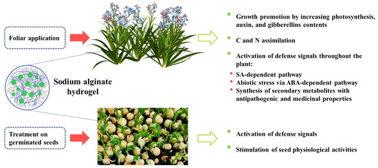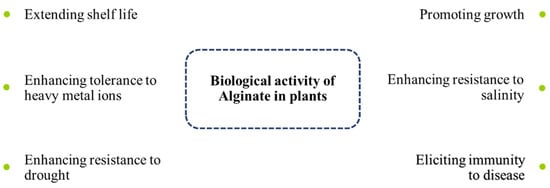 The linear ALG polymer, at physiological temperature and pH, and in the presence of some chemical initiators, can be converted to a three-dimensional polymer by a process called free-radical polymerization [102,104,105]. During this polymerization, some chemicals can be easily combined into the forming hydrogel to generate a liquid–solid phase under physiological conditions [106,107]. ALG is widely used in this way in medicine to encapsulate various drugs for delivery to target organs and tissues. The formation of hydrogels allows the use of ALG as a carrier of proteins, DNA, and live cells while maintaining their biological activity [108]. ALG is also able to stimulate the growth and development of plants and induce resistance to biotic and abiotic stresses [109]. Phenolic compounds (as secondary metabolites) can cross-link with ALG to strengthen plant cell walls against pathogen attack [110]. Figure 3 shows the biological activity of ALG in plants against different stresses and environmental factors.