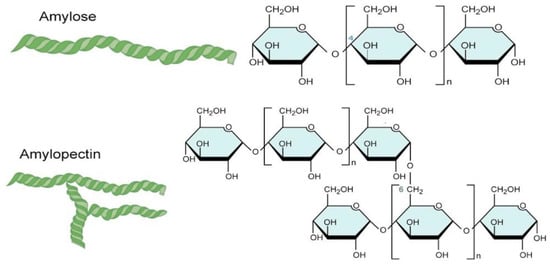 Starch is a type of carbohydrate comprised of carbon, hydrogen and oxygen with a mole ratio of 6:10:5 []. It contains two main polysaccharide units: (i) linear chain amylose, which comprises 15−20% of starch; and (ii) branched amylopectin, which composes the majority of the remaining starch. Starch is also a natural semi-crystalline biopolymer of D-glucose []. The typical structures of amylose and amylopectin in starch are illustrated in Figure 2. Amylose units form the irregular amorphous region, while the well-ordered amylopectin region contributes to the crystallinity of starch. The concentration of amylose determines the gelling ability of starch, while the concentration of amylopectin controls the water-holding capacity of starch []. As the concentration of amylose increases, more starch will be converted into a gel structure and thus increase its elongation at break [,].