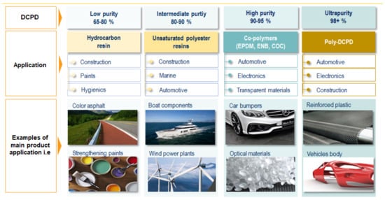 DCPD is sold in several purity grades. Lower purity grade in the 60 wt. % to 80 wt. % range is used in the production of hydrocarbon resins []. Grades with a concentration above 85 wt. % are used for the production of unsaturated polyester resins. A high purity grade typically contains 91–95 wt. % DCPD. These grades are used as a source of CPD through DCPD cracking to produce intermediates such as norbornene or ethylidene norbornene (ENB). ENB and high purity DCPD are used in the production of ethylene propylene diene rubbers (EPDM). If DCPD is used as a thermonomer for EPDM, then it tends to be the highest purity, more than 94 wt. %. High purity DCPD can be further upgraded to an ultra-pure grade of over 99 wt. % DCPD. This grade of DCPD is used to produce poly-DCPD for use in catalytic reaction injection molding (RIM).