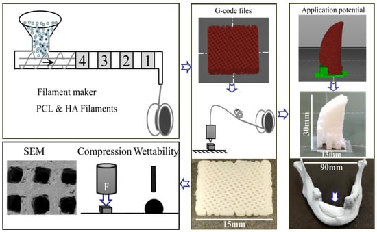 Notably, the design used in this manuscript did not consider any architectural modification that might occur in mandibular bones. To verify the clinical application potential of PCL/HA materials, a PCL + 10% HA filament was chosen as an example and produced with material-extrusion-based 3D printing technology for biomimetic bone (Figure 1) as an inexpensive and effective material. A 3D model of a patient-specific implant was designed (Materialise Mimics Innovation Suite and Prusa Slicer software). The model was printed using a gyroid infill pattern with 50% infill density (Prusa Mini printer). The combination of PCL and HA showed promising potential for clinical applications, as seen from the tests mentioned above on PCL/HA scaffolds. In this case, material-extrusion-based 3D printing technology enabled the fabrication of a complex PCL/HA personalized implant. In addition, the relatively low cost of PCL/HA materials will benefit more patients who need bone defect reparations due to tumors and trauma. Additionally, in this case, we successfully demonstrated the feasibility of using a well-described material for thermal filament production and scaffold fabrication, using entry-level equipment translatable to hospital environments in lower-income countries for bone applications.