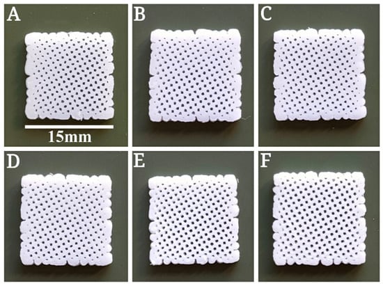 Examples of printed six groups’ scaffolds (15 × 15 × 2 mm). (A) PCL. (B) PCL + 5% HA. (C) PCL + 10% HA. (D) PCL + 15% HA. (E) PCL + 20% HA. (F) PCL + 25% HA.